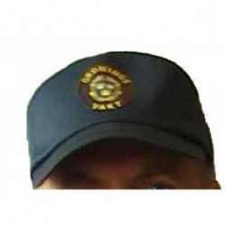 Marin blå färg. Keps med ordningsvakt märke påsytt.