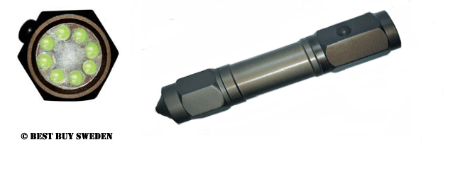 Räddnings ficklampa 8 LED ficklampa i metall av tålig och robust design med glaskross verktyg i änden på ficklampan och stark lyskraft. Räddningsficklampan har också kniv för att kunna skära loss bilbälten och liknande med. Denna sitter under skruvlocket i änden på ficklampan. Längd: 15,5cm |