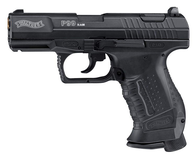 Walther P99 RAM Svart paintballpistol .43" kaliber Smidig och välbalanserad Paintball pistol i RAM serien från tyska Walther. En pistol med mycket hög kvalitet och som delar de flesta funktioner med den riktiga modellen, bla Single/dubbel-action och blowback.Stomen är tillverkad i polymer. Inre delar, pipa och mantel är gjord av metall. Walther P99 har en decockingknapp för att slacka hanen. Walther P99 är den pistol som används av James Bond i de senaste filmerna. Magasinet rymmer 9st färgkulor i cal .43 och pistolen drivs med en 12g kolyrepatron. En patron räcker till ca 40-50skott. Pistolen levereras med pipplugg, rengörningshjälpmedel, olja samt ett utbytbart greppinlägg. Allt exklusivt förpackat i en hård, vaderad väska. Tekniska specifikationer: |