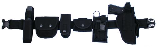 Bältet är ett utrustningsbälte med dubbel låsning. Bältet levereras med följande hållare: Vapen hölster för 9mm pistol med extra magasin ficka. Svart färg. Cordura material. |